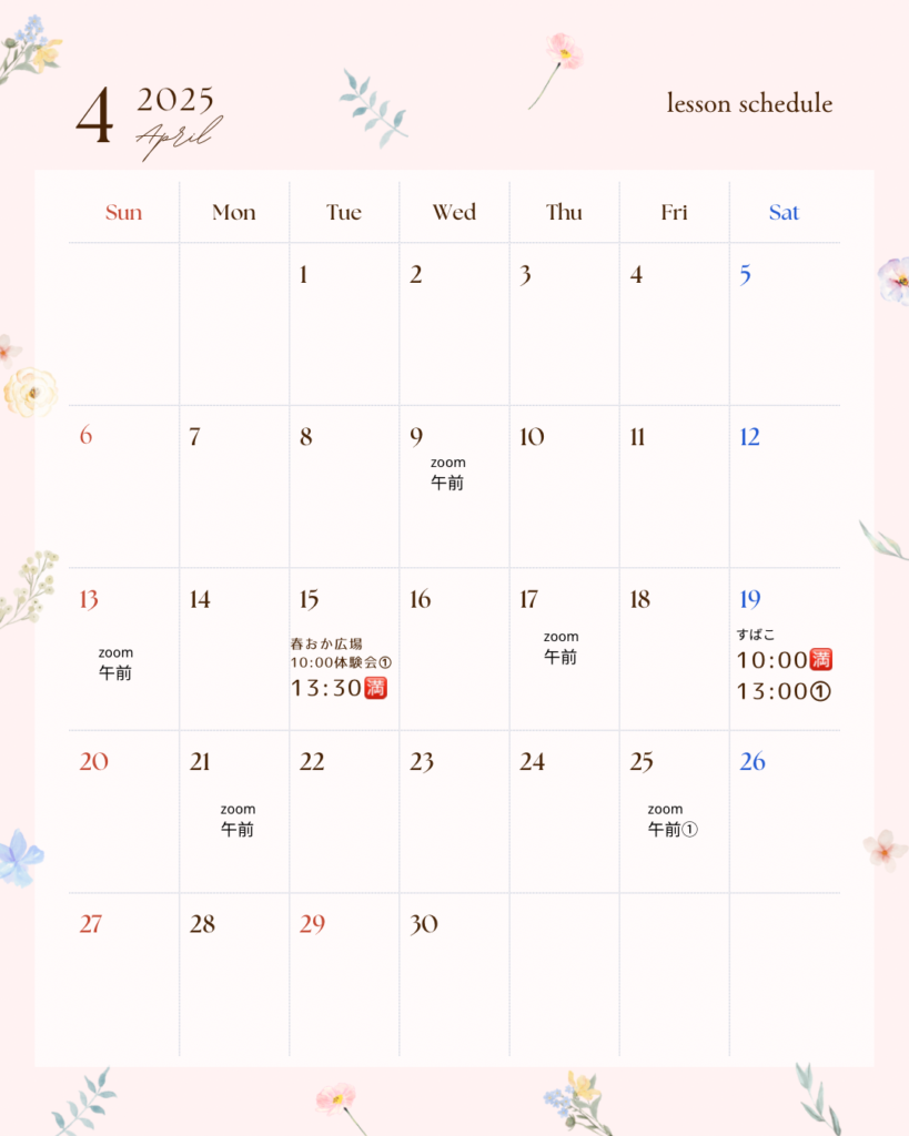 2025-03-16 / 最終更新日時 : 2025-03-18 konoki レッスン日程 4月レッスンスケジュール お問い合わせお申し込みは、ホームページ内contact、または公式ラインからお願いします。追加・変更の場合があります。 https://lin.ee/RghkN2g コメントを残す コメントをキャンセルメールアドレスが公開されることはありません。 ※ が付いている欄は必須項目ですコメント ※ 名前 ※ メール ※ サイト 次回のコメントで使用するためブラウザーに自分の名前、メールアドレス、サイトを保存する。 上に表示された文字を入力してください。