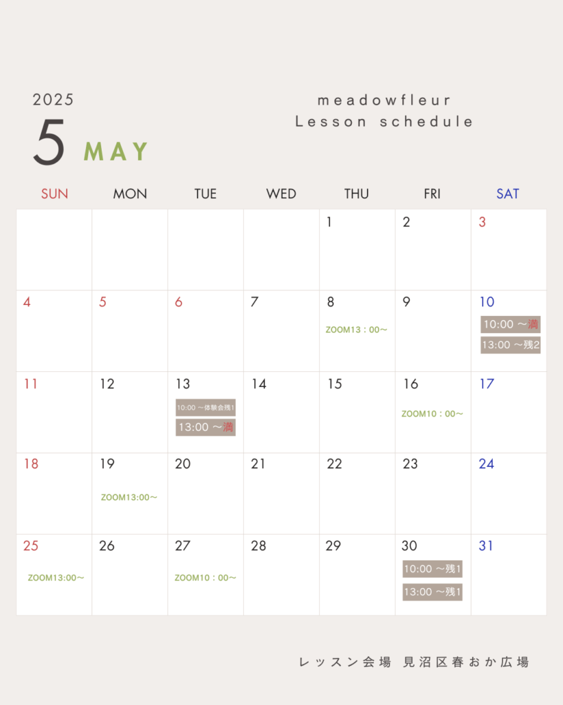 2025-04-18 / 最終更新日時 : 2025-05-21 konoki レッスン日程 5月レッスンスケジュール 5月のレッスン日程が残りわずかとなりました。キャンセル待ちもできますので、ご相談ください。 お問い合わせお申し込みは、ホームページ内contact、または公式ラインからお願いします。追加・変更の場合があります。 https://lin.ee/RghkN2g コメントを残す コメントをキャンセルメールアドレスが公開されることはありません。 ※ が付いている欄は必須項目ですコメント ※ 名前 ※ メール ※ サイト 次回のコメントで使用するためブラウザーに自分の名前、メールアドレス、サイトを保存する。 上に表示された文字を入力してください。